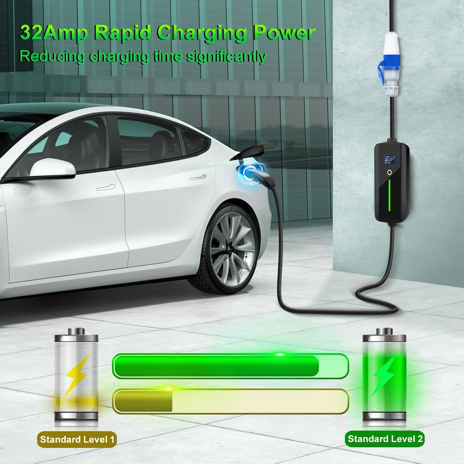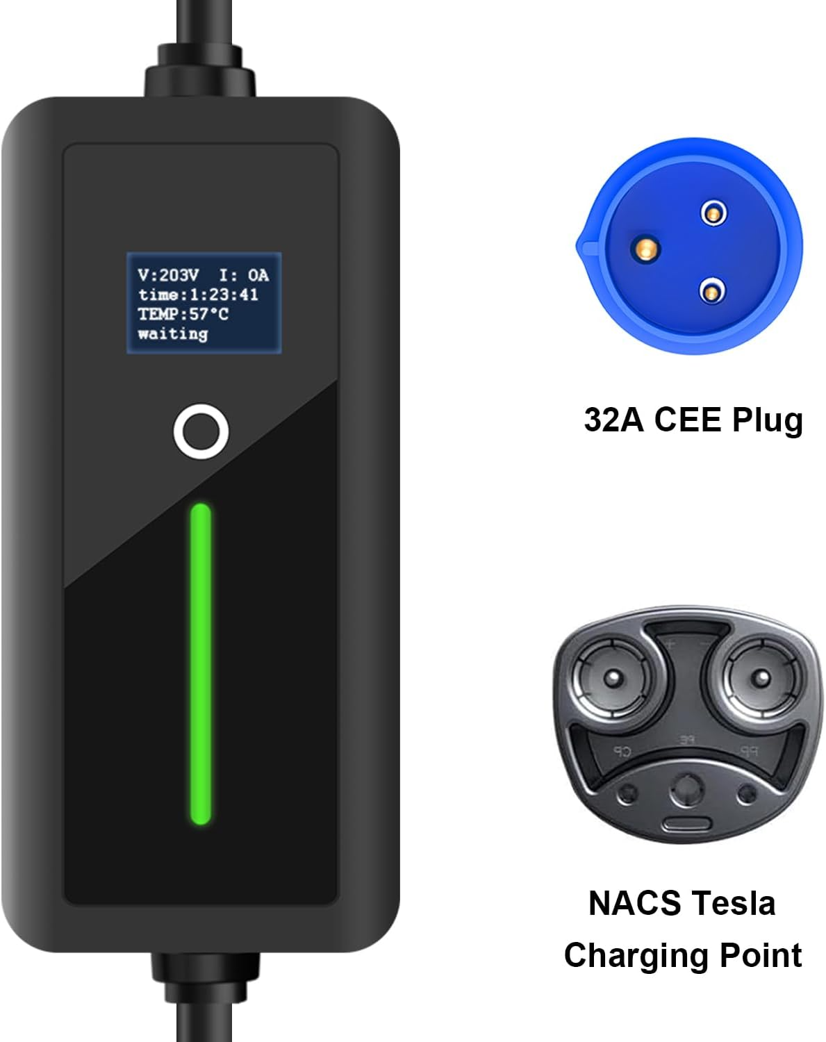 Premium Tesla Charger | 32A, 7kW | 5m Cable | CEE Adapter | Weatherproof | LCD Display | EV Charger For Model 3,Y,S,X & Cybertruck